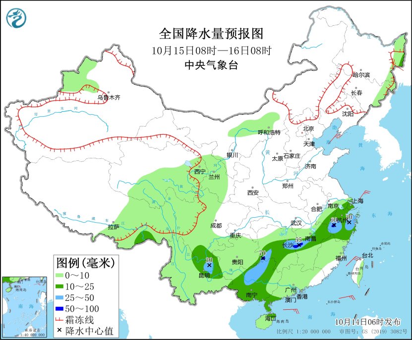 10月15日08时至16日08时,云南东北部、贵州东南部、广西大部、湖南中部、江西中部、浙江大部等地部分地区有中到大雨,其中,湖南西部、江西中部、浙江西部等地局部地区有暴雨(50~70毫米)。青海南部、西藏东部、四川西部等地有小到中雪或雨夹雪(见图3)。