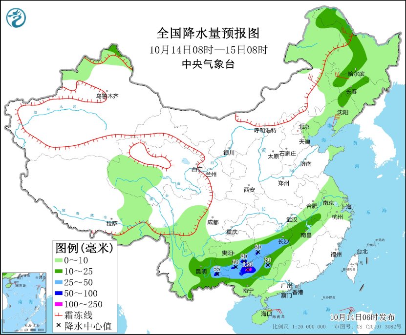 10月14日08时至15日08时,东北地区西部、云南东部、贵州南部、广西中北部、湖南中部和西部、江西西北部等地部分地区有中到大雨,其中,云南东部、贵州南部、广西北部、湖南西南部等地部分地区有暴雨或大暴雨(100~120毫米)。内蒙古东北部、黑龙江西北部、新疆北部高海拔山区有中到大雪,局地暴雪。内蒙古中部和北部、东北地区等地部分地区有5~6级风,阵风7~8级(见图2)。