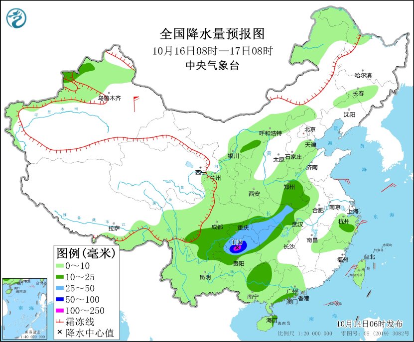 10月16日08时至17日08时,四川东南部、重庆中南部、贵州中北部、湖南西北部、湖北西南部和中部等地部分地区有中到大雨,其中,四川东南部、贵州北部等地局部地区有暴雨或大暴雨(100~110毫米)。内蒙古东北部、黑龙江西北部、新疆西部、青海南部、西藏东部、四川西部等地有小到中雪,局地大雪或暴雪(见图4)。