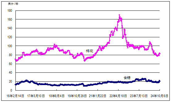 泰国100%B级和5%破碎率大米曼谷离岸周均价每吨分别为549美元和533美元,环比均跌7%,同比均低11%;国际糖料理事会原糖周均价每磅21.53美分(每吨475美元),环比跌4%,同比低14%;国际棉花价格指数(SM级)每磅82.85美分(每吨1827美元),环比跌1%,同比低18%。