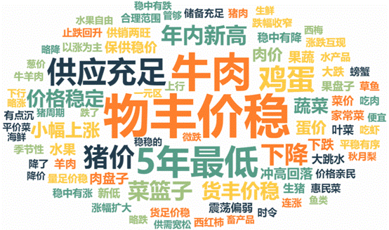 4.水果均价略有下降。重点监测的6种水果周均价每公斤7.26元,环比跌0.1%,同比高10.5%。分品种看,菠萝、鸭梨、巨峰葡萄和富士苹果周均价环比分别跌2.7%、0.8%、0.8%和0.2%;香蕉和西瓜周均价环比分别涨2.9%和1.9%。