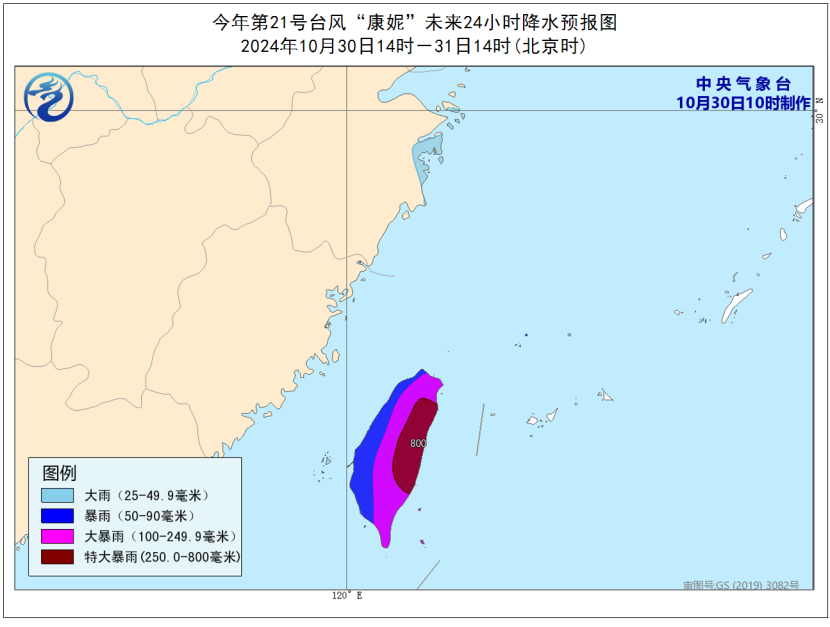 降水预报:30日14时至31日14时,台湾岛有暴雨或大暴雨,其中台湾岛东部的部分地区有特大暴雨(250-800毫米)。