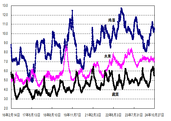 据农业农村部监测,2024年第43周(2024年10月21日—10月27日,下同)“农产品批发价格200指数”为127.64(以2015年为100),比前一周降2.40个点,同比高10.67个点;“‘菜篮子’产品批发价格指数”为129.84(以2015年为100),比前一周降2.81个点,同比高13.27个点。
