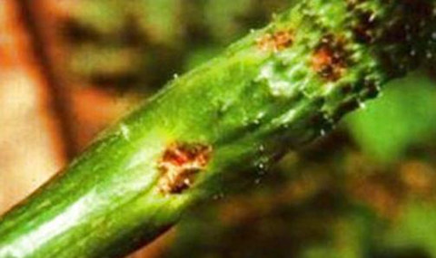 症状叶片上的“虫口”呈现“星状”穿孔,孔的边缘很不整齐,并有黄色晕圈,叶脉扭曲,叶片皱缩不平整,嫩茎上的病斑凹陷龟裂,有透明的胶粒溢出。这是黄瓜黑星病,属于真菌性病害,是我国的检疫病害,是大棚的毁灭性病害之一。相对湿度在90%左右,温度在9℃~0℃都可发生。病菌从作物的表皮、气孔、伤口侵入。棚膜及棚内作物叶片有水珠存在,是该病害发生的重要条件。棚内湿度大、光照弱、浇水后遇上连阴天的气候条件下发病重。病菌以菌丝体在大棚中存在,成为最初的传染源;也可以分生孢子附着在种子表面或以菌丝体潜伏在种皮内使种子带菌,种子带菌可侵染幼苗,带菌的苗子定植后会很快发病。