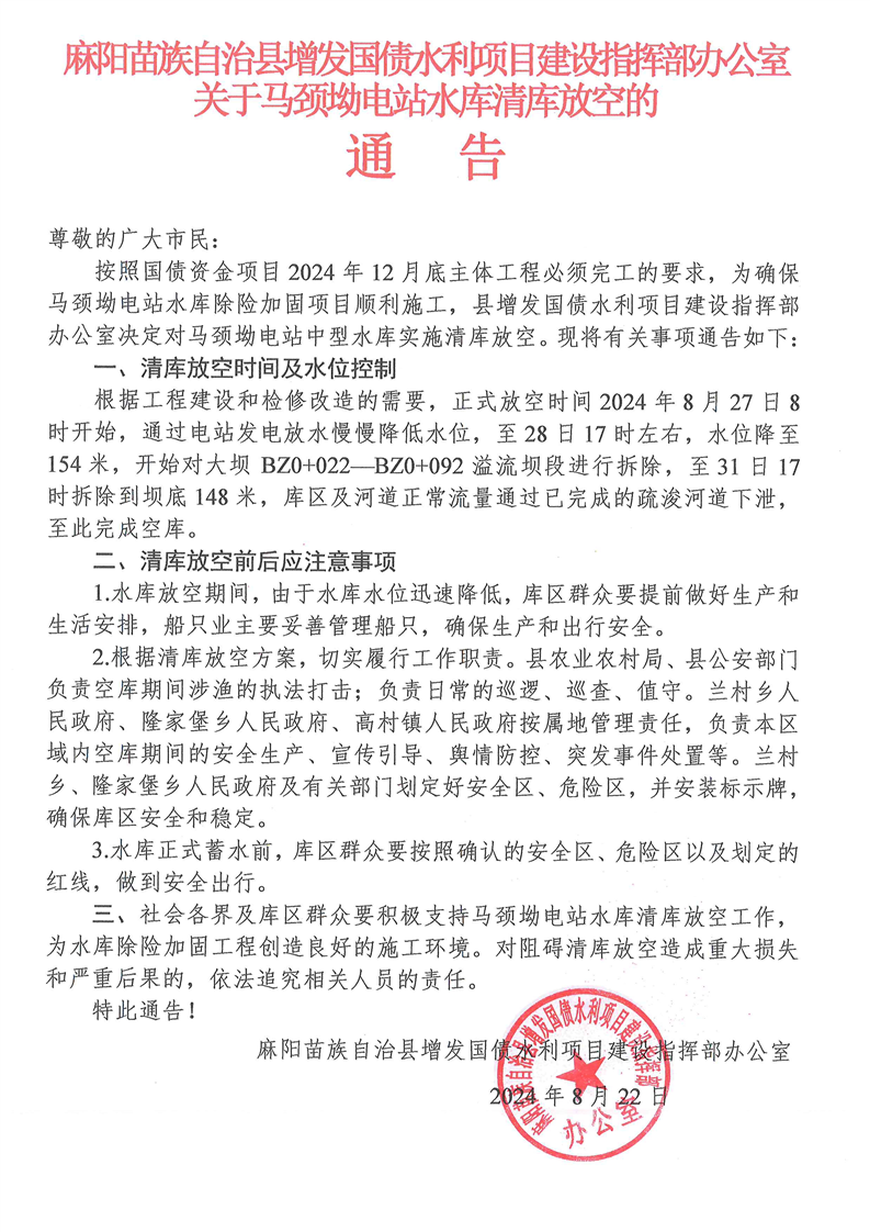 麻阳苗族自治县增发国债水利项目建设指挥部办公室关于马颈坳电站水库清库放空的通告