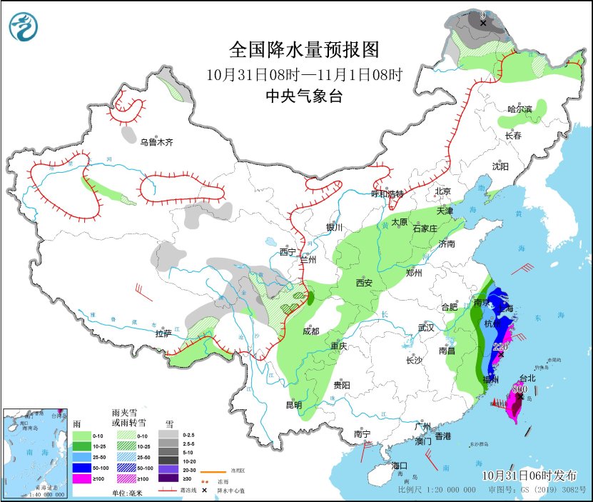 10月31日08时至11月1日08时,内蒙古东北部、黑龙江西北部、新疆北疆北部、西藏东部、青海南部和西部、甘肃西南部、川西高原北部等地部分地区有小雪或雨夹雪,其中,内蒙古东北部、黑龙江西北部等地部分地区有中到大雪(5~9毫米)。江苏南部、上海、浙江大部、福建东北部、台湾岛等地部分地区有大到暴雨,其中,浙江东部、福建东北部、台湾岛有大暴雨,台湾岛中东部和南部等地局地特大暴雨(250~800毫米)。西藏北部部分地区有5~6级风(见图4)。
