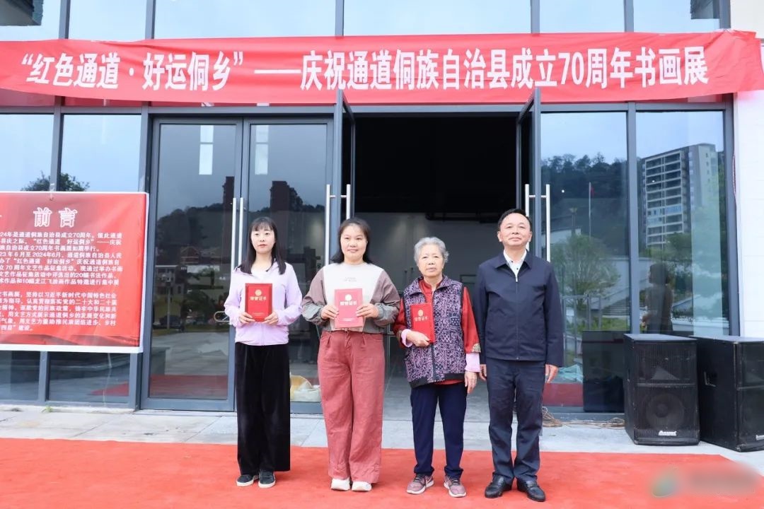 好运侗乡”庆祝通道侗族自治县成立70周年文艺作品征集活动获奖作品、部分特邀作品及龙江飞老师作品,这些作品以通道风光、人物、民俗等为主题,生动描绘通道的自然之美和人文之美,展现通道人民奋发向上的精神面貌。本次展览将持续到10月22日。 田刚表示,此次书画展坚持以铸牢中华民族共同体意识为主线,用文艺的画笔描绘通道侗乡的新时代风貌,用文艺的力量助推高质量发展,用文艺的纽带连接民族团结进步。县委、县政府将持续支持相关部门、文艺爱好者深入挖掘、传承和发展红色文化与民族文化,大力推动文化事业和文化产业加快发展,全力打造具有鲜明特色和深刻内涵的民族文化品牌。 开展仪式上,还对70周年县庆文艺作品征集活动获奖者进行颁奖,并举行了龙江飞画家赠画仪式。