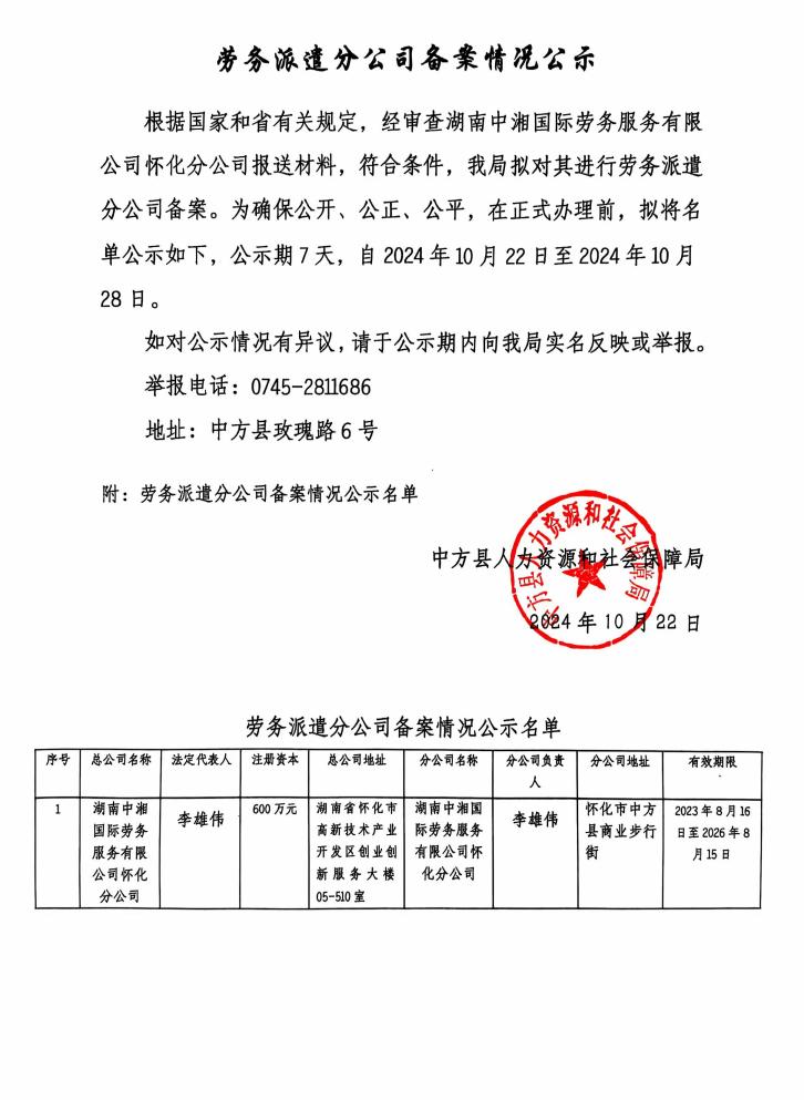 劳务派遣分公司备案情况公示