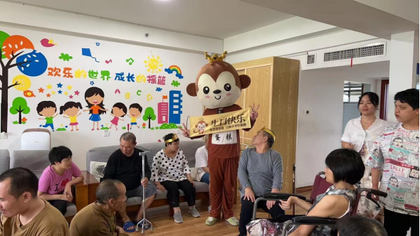 活动期间我们邀请的爱心人士身穿玩偶服为寿星戴上生日帽并合影,“小猴子”的一首唱跳舞曲《黑桃A》一下子活跃了现场气氛,对象们也一起“动”了起来。随后“小猴子”带领工作人员和全体对象为两位“寿星”唱生日歌,并送上真挚的祝福。