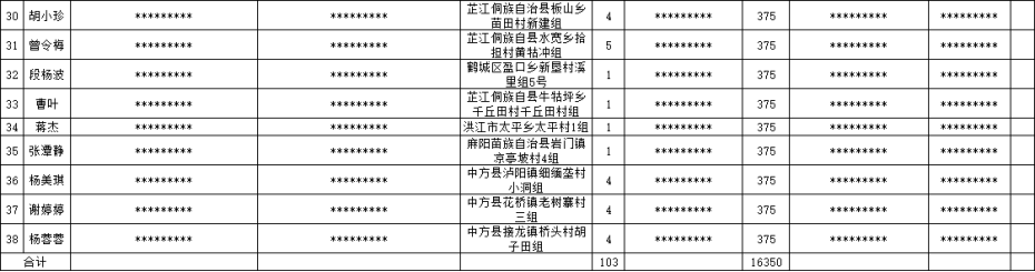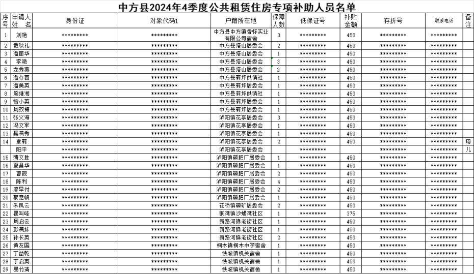 中方县2024年4季度公共租赁住房专项补助人员名单