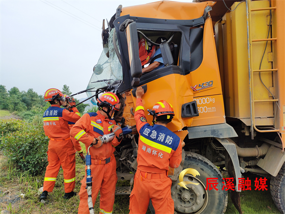 8月21日,辰溪县消防救援大队东星消防救援站接到群众报警电话:沅水二桥方向一辆大货车撞向了路边的绿化带,导致货车司机被困车内无法动弹,请消防部门救援。接到报警电话后,东星消防救援站立即调派1车7名消防救援人员赶赴现场。